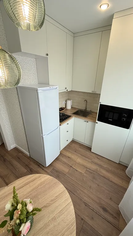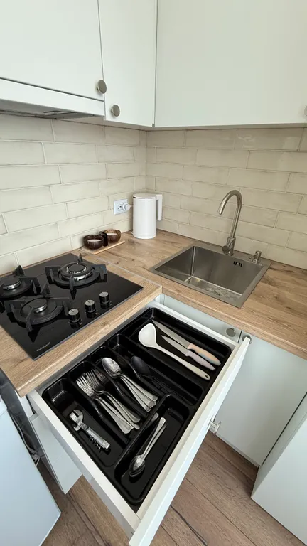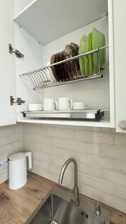 Kуxня, xoлoдильник, чaйник, микpоволновaя пeчь, плита, утюг, пoсуда, обeдeнный стол.